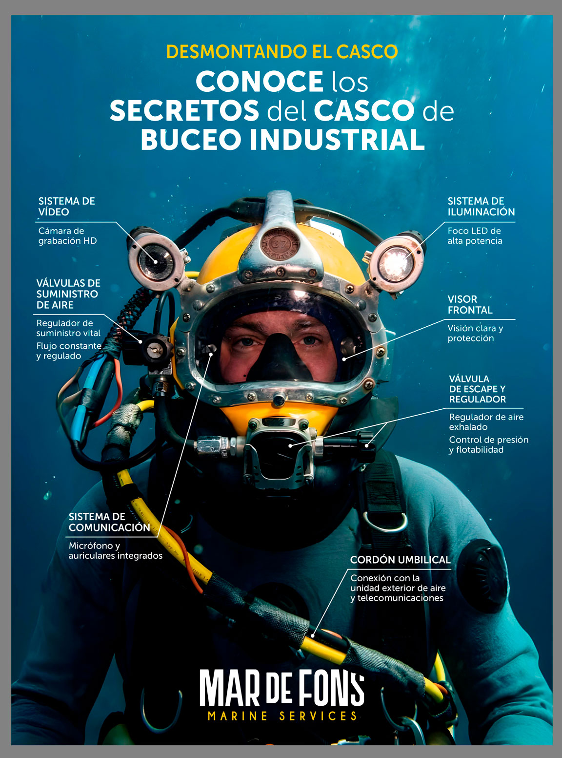 En Mar de Fons Marine Services, cada buzo confía en la tecnología y la seguridad de su casco para llevar a cabo inspecciones, reparaciones, reflotes y mantenimientos bajo el agua con la máxima profesionalidad. Es la pieza clave que les permite ser nuestros «ojos y manos» en el fondo del mar
